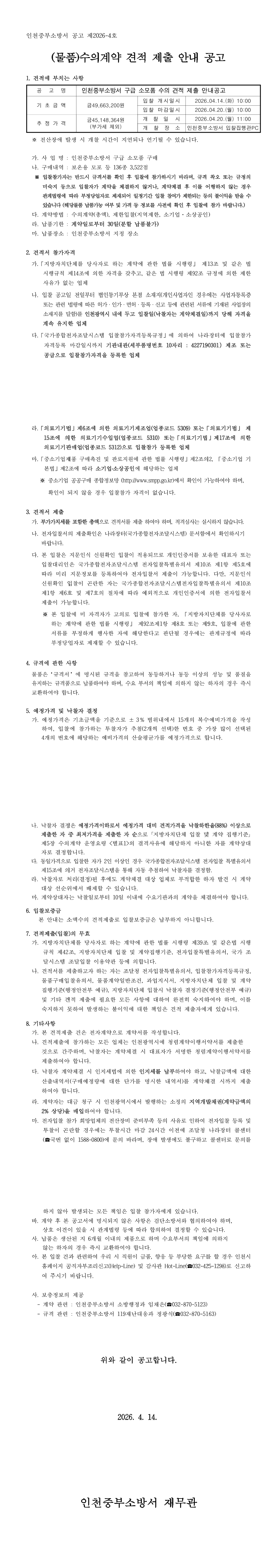 인천중부소방서 구급 소모품 수의 견적 제출 안내 |