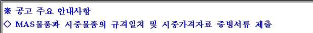 ※ 본 물품은 ‘시중에서 거래되는 수요물자’로 「물품 다수공급자계약 업무처리규정」제15조제4항 단서조항에 따라 세부품명별 시중거래실례가격 3건 이상, 품목(규격)별 시중거래실례가격 1건 이상이고 품목별 규격이 시중에서 거래되는 규격과 동일한 경우에 한해 가격협상대상 품목으로 선정이 가능합니다.