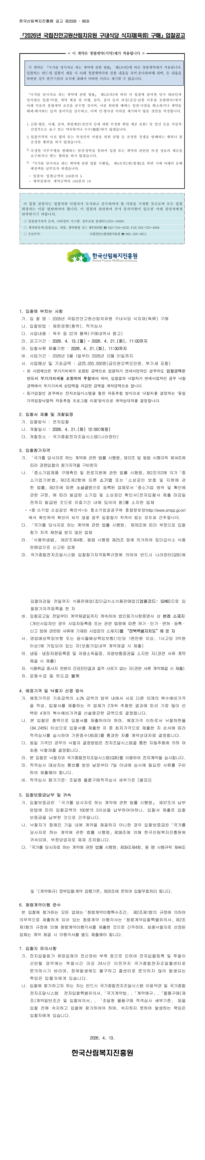 2026년 국립진안고원산림치유원 구내식당 식자재(육류) 구매 |