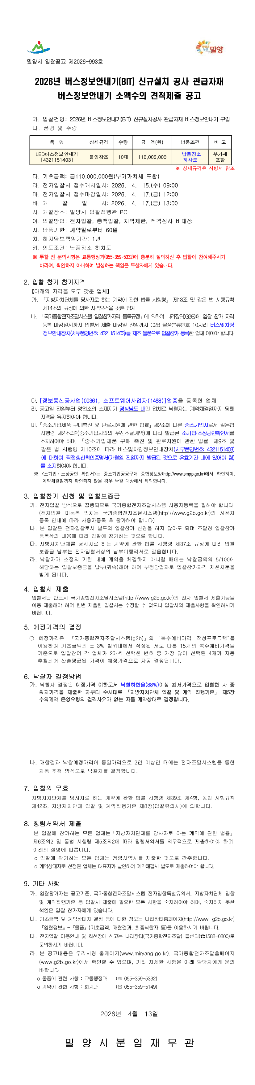 2026년 버스정보안내기(BIT) 신규설치 공사 관급자재 버스정보안내기 소액수의 견적제출 공고 |