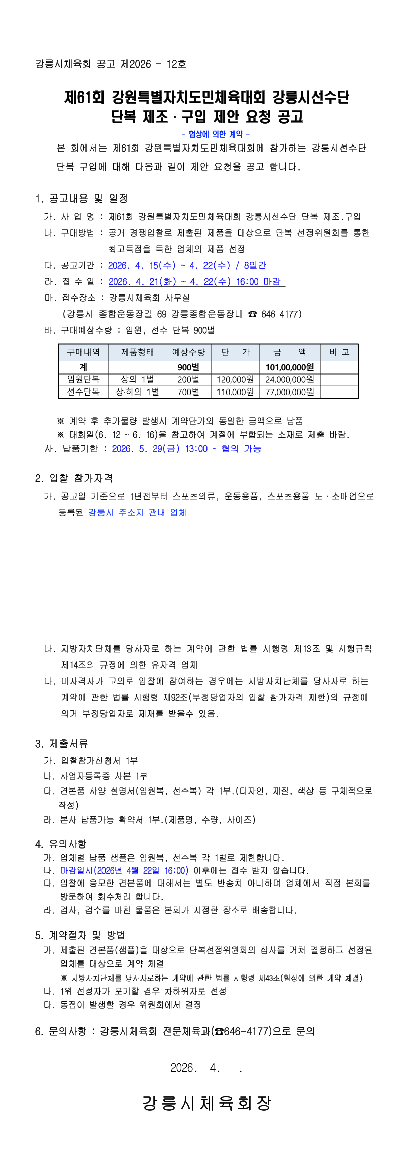제61회 강원특별자치도민체육대회 강릉시 선수단 단복 제조.구입 |
