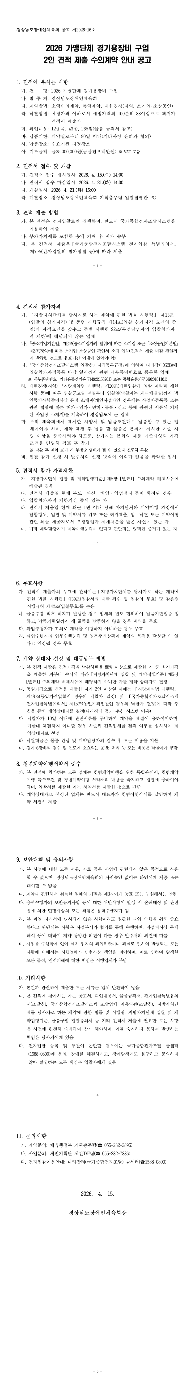 2026 가맹단체 경기용장비 구입 2인 견적 제출 수의계약 안내 공고 |