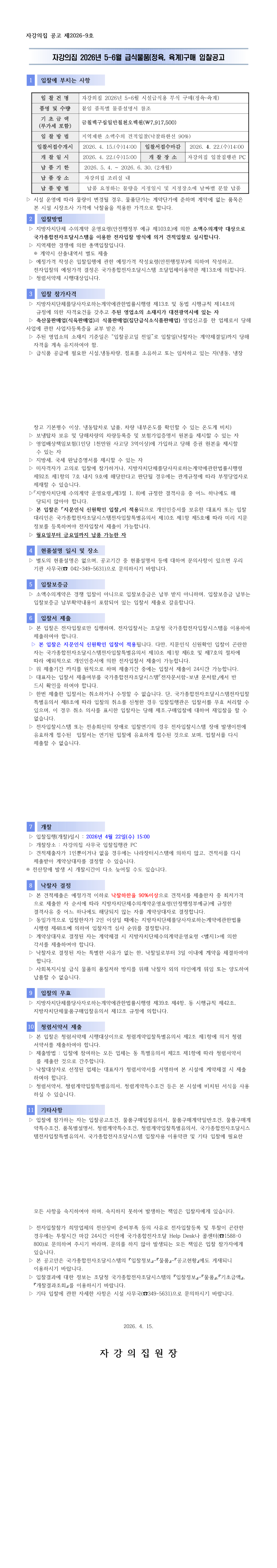 자강의집 2026년 5-6월 급식물품 [정육,육계]구매 입찰 공고 |