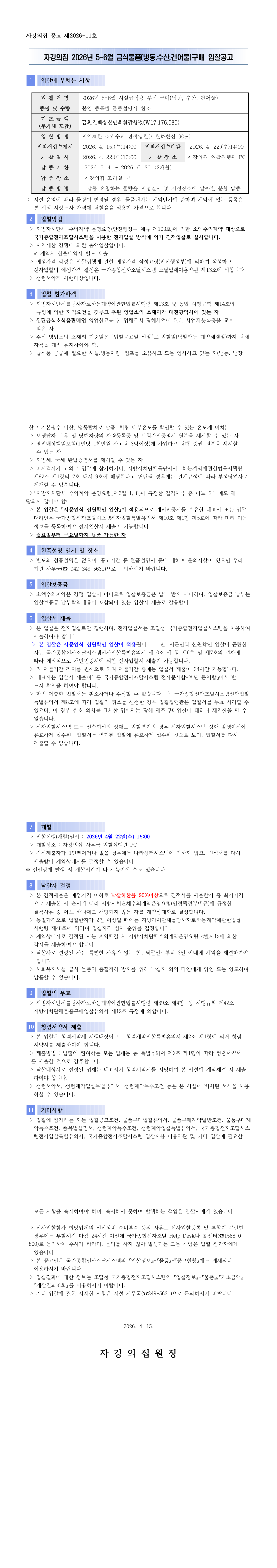 자강의집 2026년 5-6월 급식물품 [냉동,수산,건어물]구매 입찰 공고 |