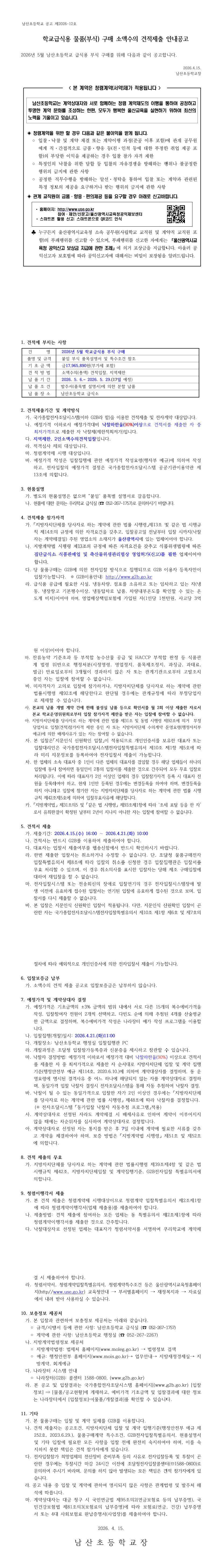 2026년 5월 남산초등학교 학교급식용 물품(부식) 구입 소액수의 견적 제출 안내 공고 |