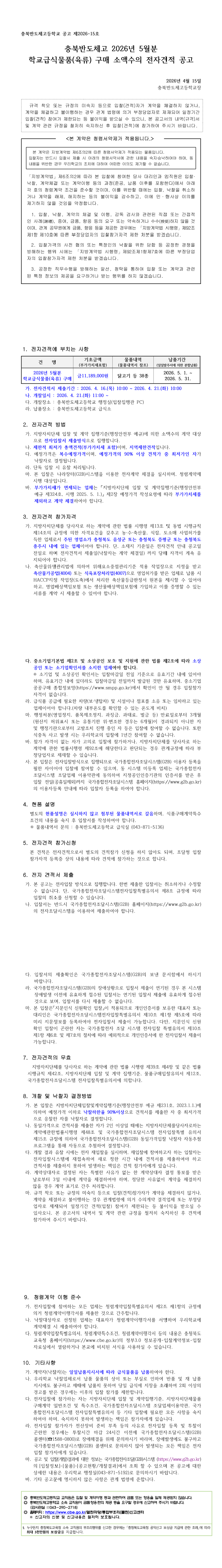 2026년 5월 충북반도체고 학교급식물품(육류)구매 소액수의 전자견적 공고 |