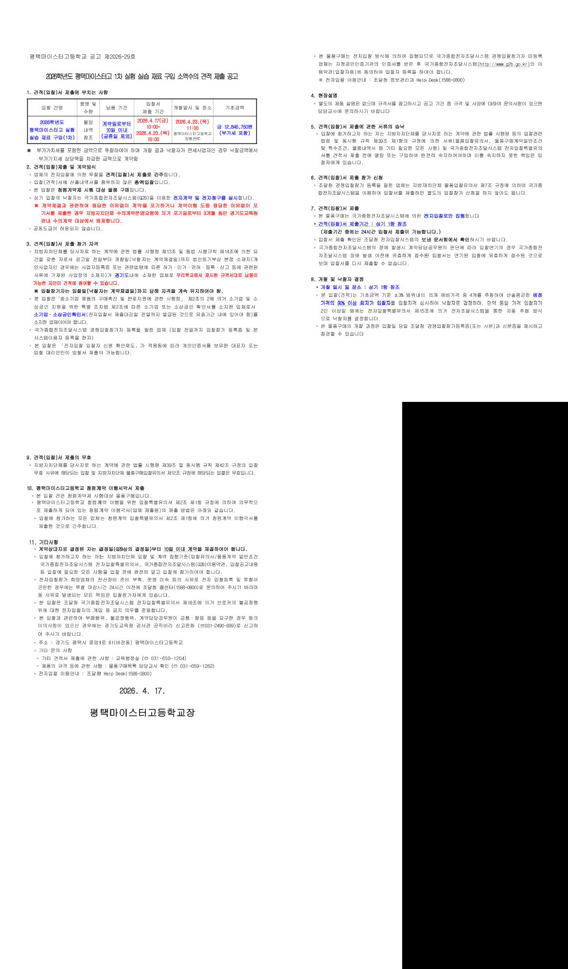 2026학년도 평택마이스터고 1차 실험 실습 재료 구입 소액수의 견적 제출 공고 |