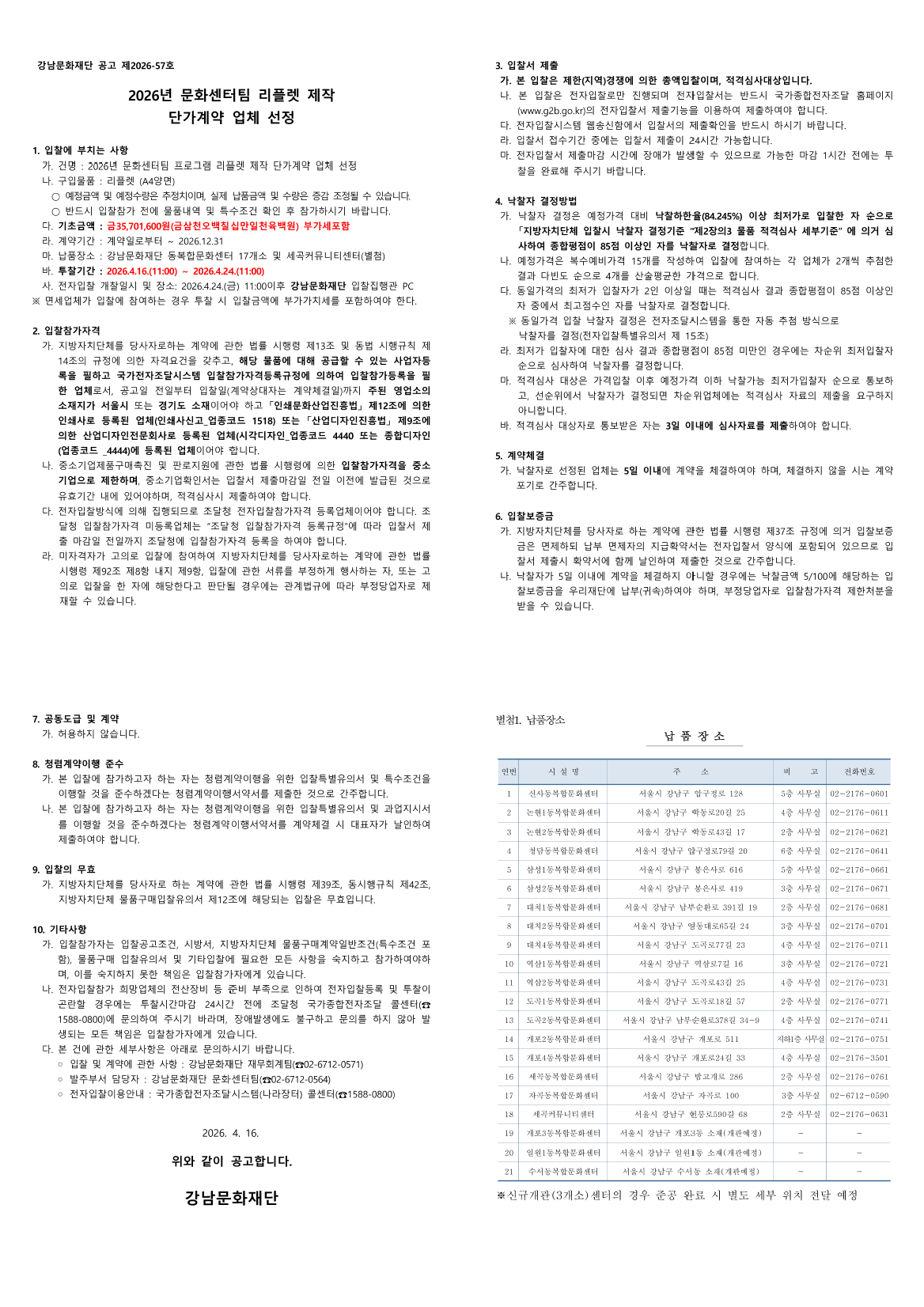 [강남문화재단] 2026년 문화센터팀 프로그램 리플렛 제작 단가계약 업체 선정 |