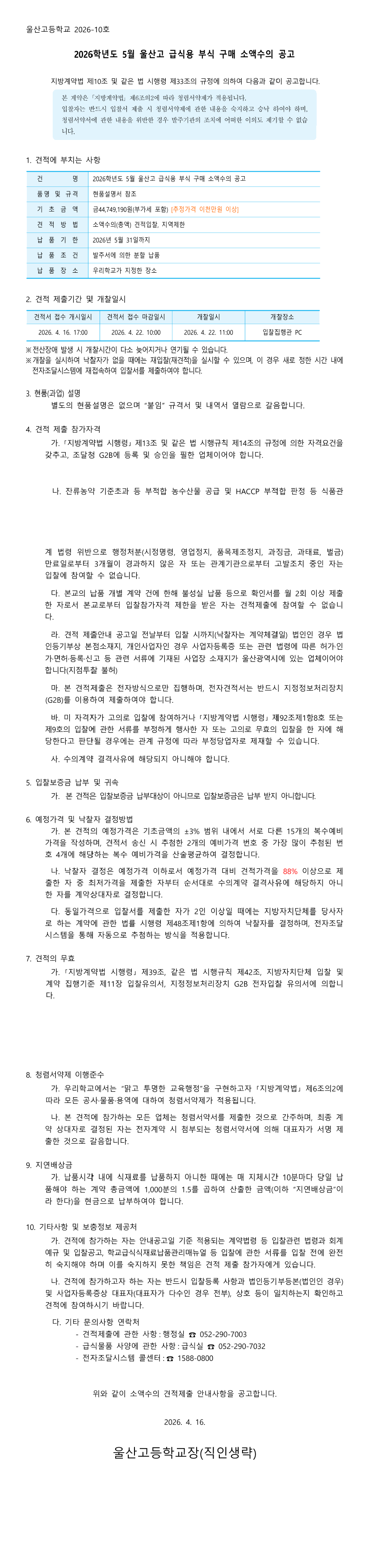 26학년도 5월 울산고 급식용 식재료(부식) 구매 수의계약 견적제출 공고 |