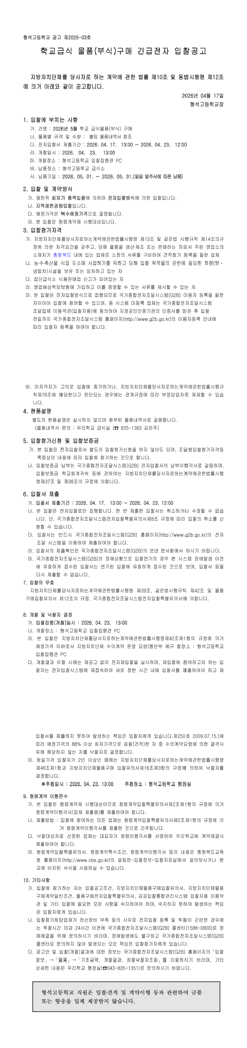 2026학년도 형석고 5월 학교급식 물품 부식 구입 긴급 전자입찰 공고 |