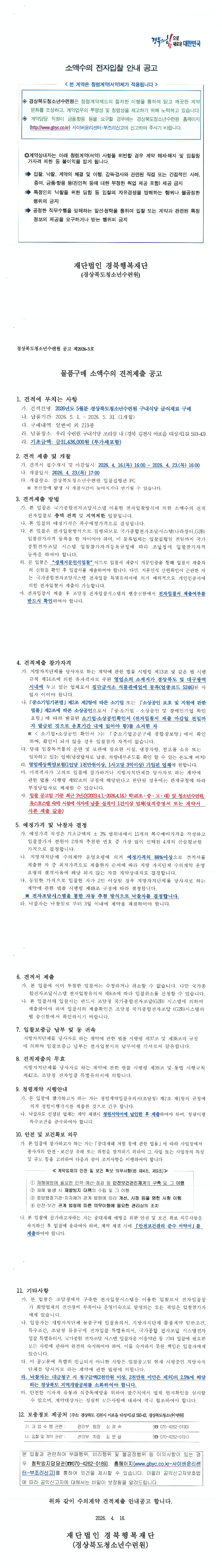 2026년도 5월분 경상북도청소년수련원 구내식당 급식재료 구매 |