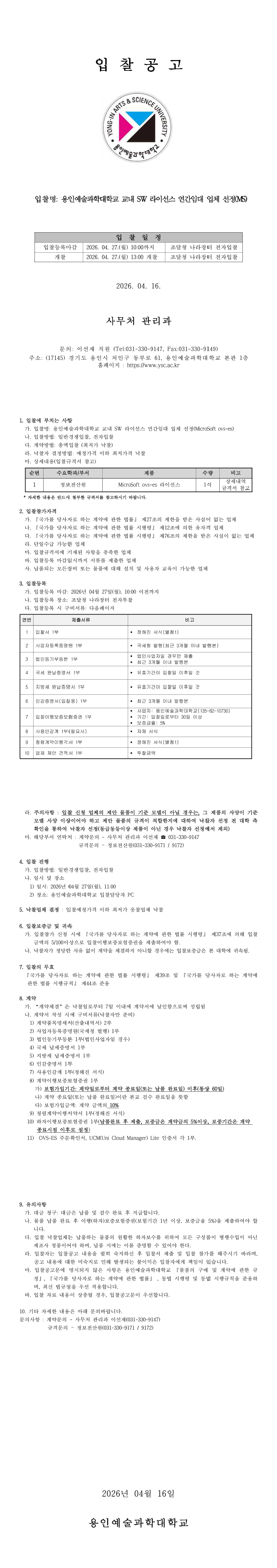 용인예술과학대학교 교내 S/W 라이선스 연간임대 업체 선정(MicroSoft ovs-es) |