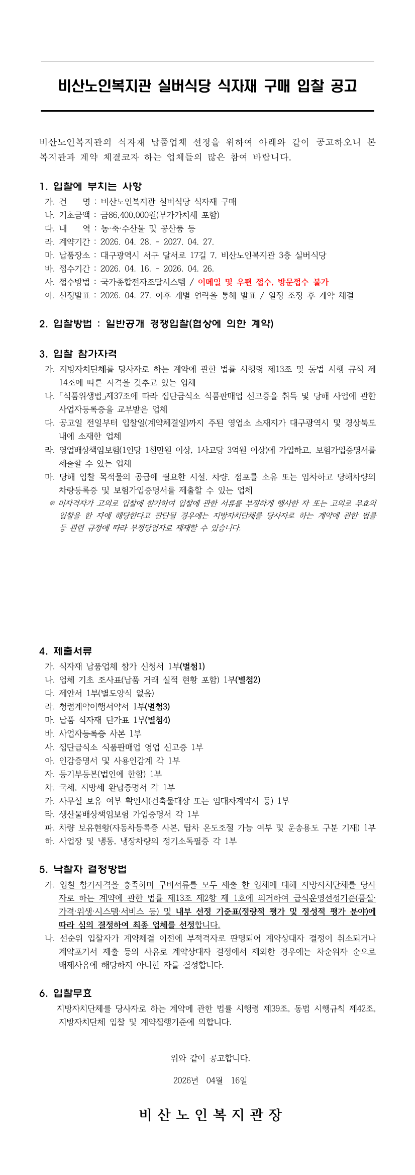 비산노인복지관 실버식당 식자재 구매 입찰 공고 |