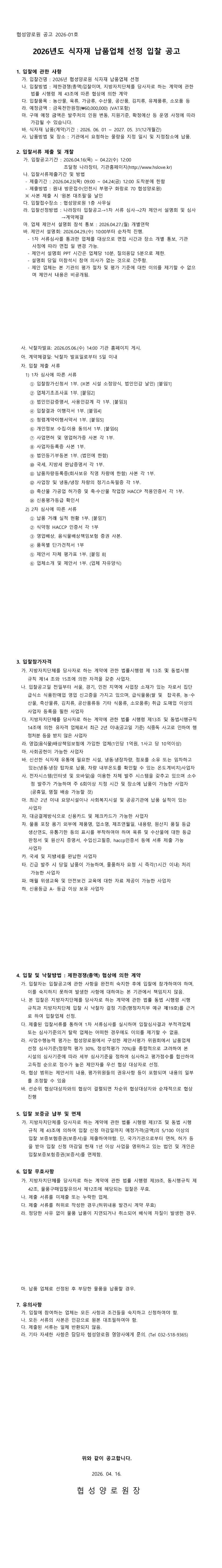 2026년도 협성양로원 식자재 납품업체 선정 |