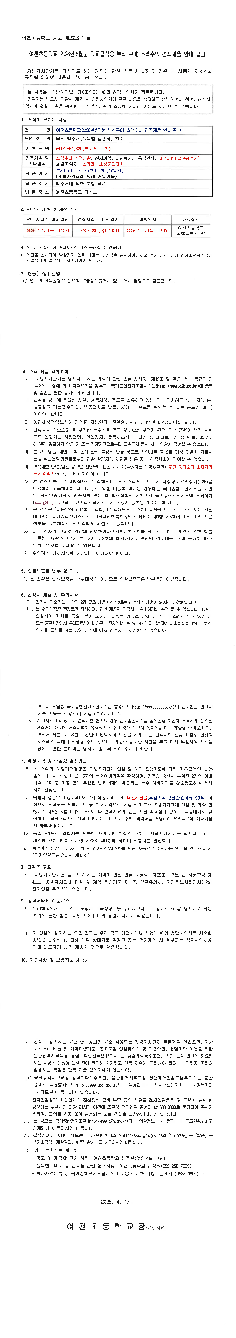 2026년 5월분 학교급식용 부식 구매 소액수의 견적제출 안내 공고 |