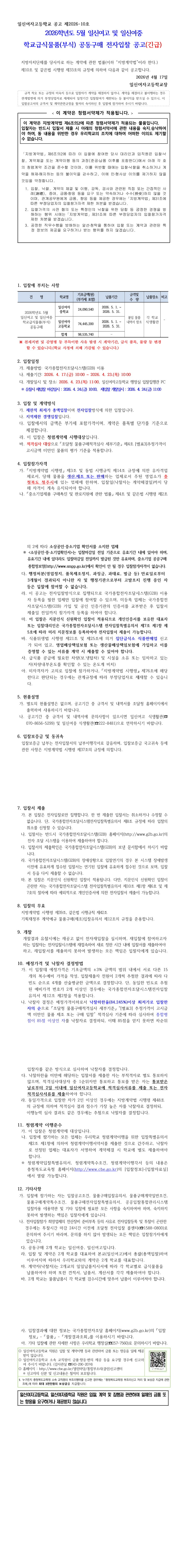 2026학년도 5월 일신여고 및 일신여중 학교급식물품(부식) 공동구매 전자입찰 공고(긴급) |