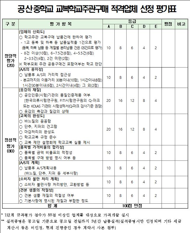 ※ 계약상대자로 선정된 업체는 본교와 교복 구매 계약 시 교복(하복, 동복, 체육복) 1벌의 품목별 가격을 구분하여 제시하여야 하며, 본교 학생이 필요에 따라 품목별로 추가 구매할 수 있도록 보장하여야 합니다.