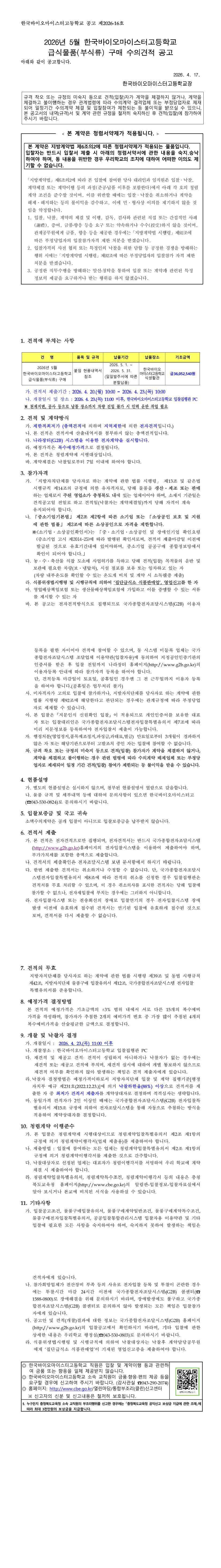 2026년 5월 한국바이오마이스터고등학교 급식물품(부식류) 구매 수의견적 공고 |