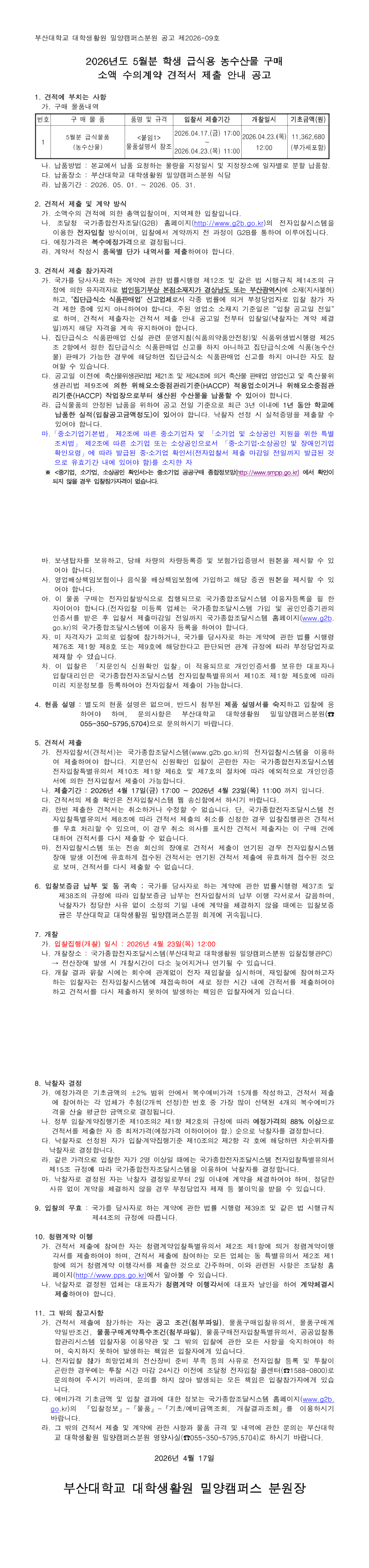 부산대학교 대학생활원 밀양분원 2026. 5월분 농수산물 구매 수의계약 견적 제출 공고 |