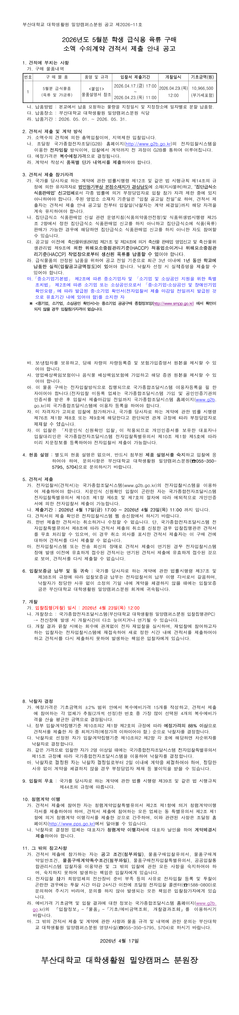 부산대학교 대학생활원 밀양분원 2026. 5월분 육류 구매 수의계약 견적 제출 공고 |
