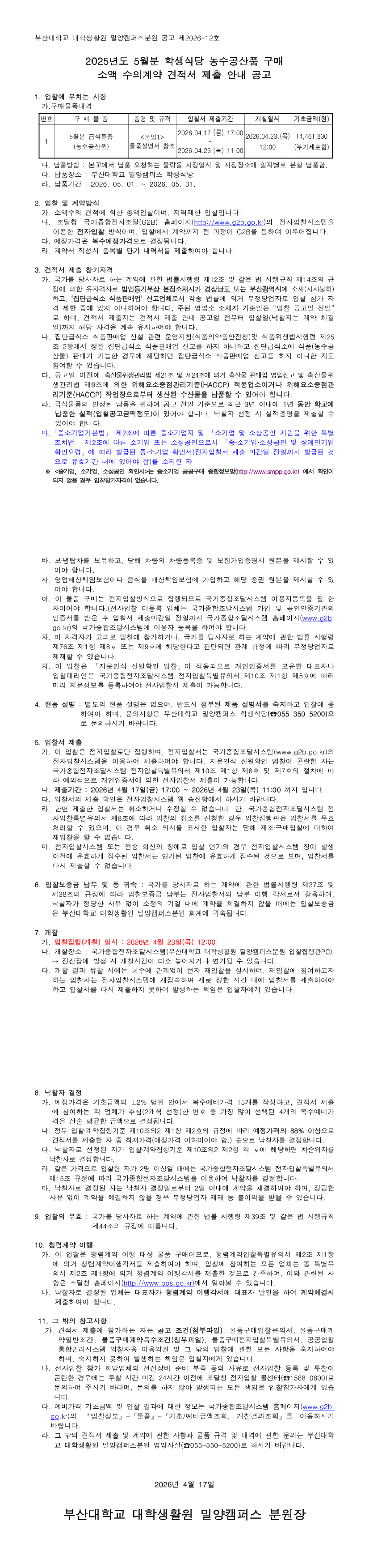 부산대학교 밀양캠퍼스 학생식당 2026. 5월분 농수공산품 구매 수의계약 견적 제출 공고 |