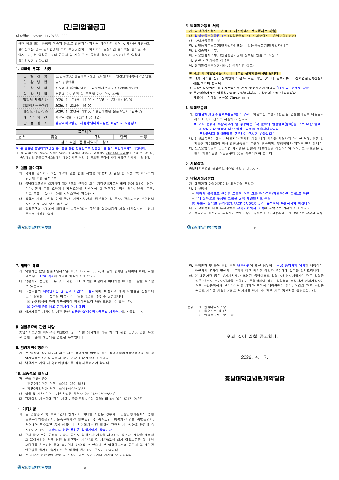 (긴급)2026년 충남대학교병원 동위원소재료 연간단가계약(새로운 입찰) |