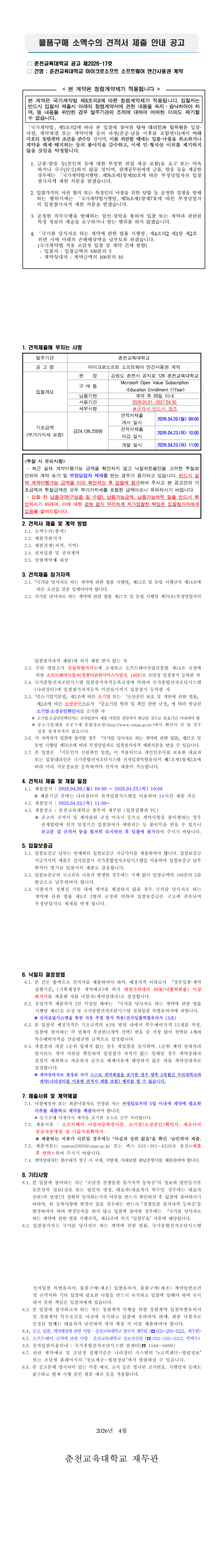 2026년 춘천교육대학교 마이크로소프트 소프트웨어 연간사용권 계약 |