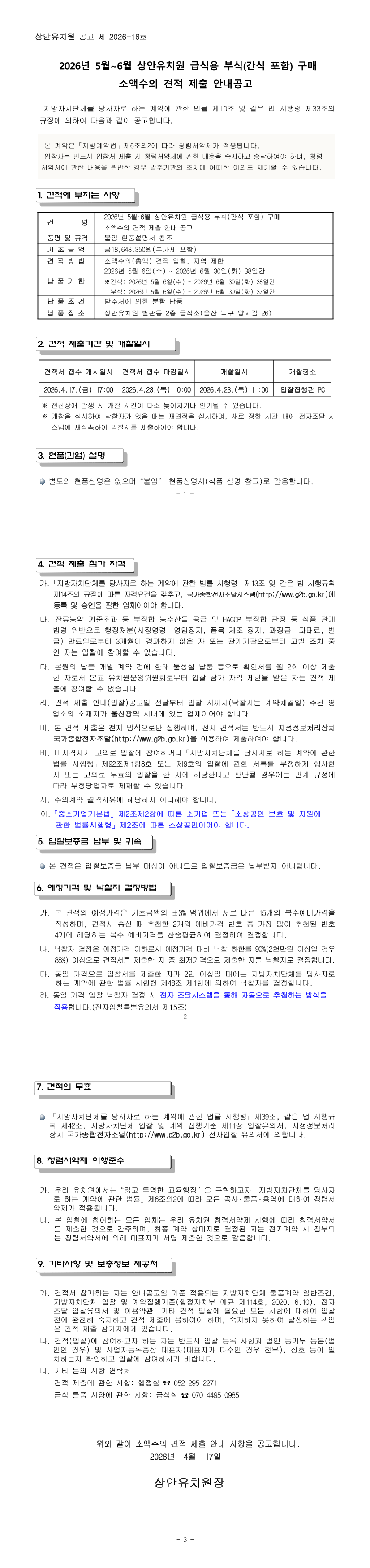 2026년 5월~6월 상안유치원 급식용 부식(간식 포함) 구매 소액수의 견적 제출 안내공고 |