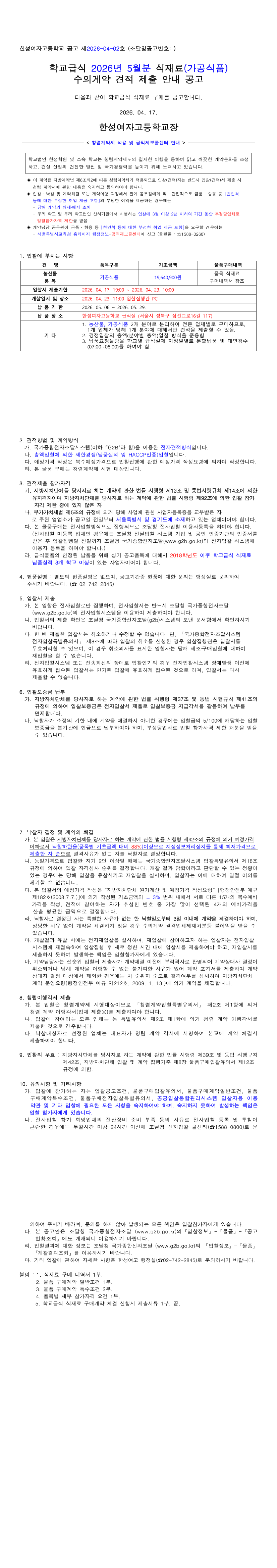 학교급식 2026년 5월분 식재료(가공식품) 수의계약 견적 제출 안내 공고 |