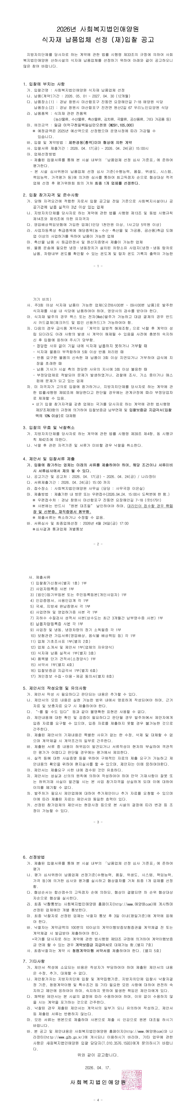 2026년 사회복지법인애양원 식자재 납품업체 선정 (재)입찰 공고 |