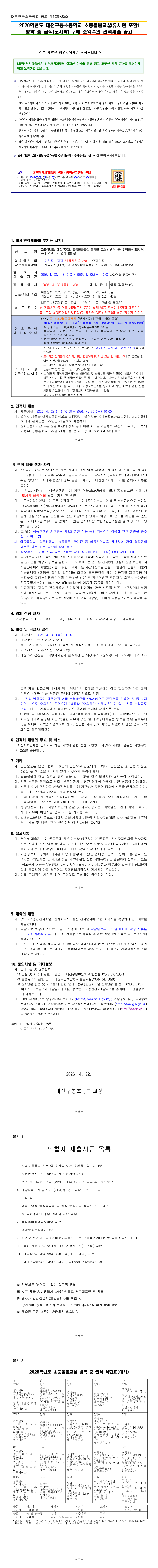 2026학년도 대전구봉초등학교 초등돌봄교실(유치원 포함) 방학 중 급식(도시락) 구매 소액수의 공고 |