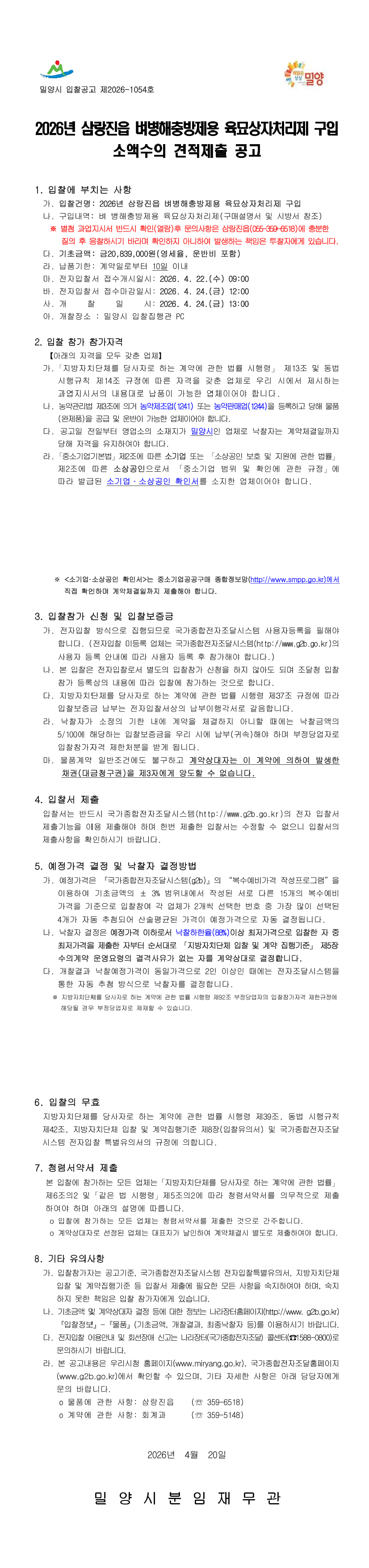 2026년 삼랑진읍 벼병해충방제용 육묘상자처리제 구입 |