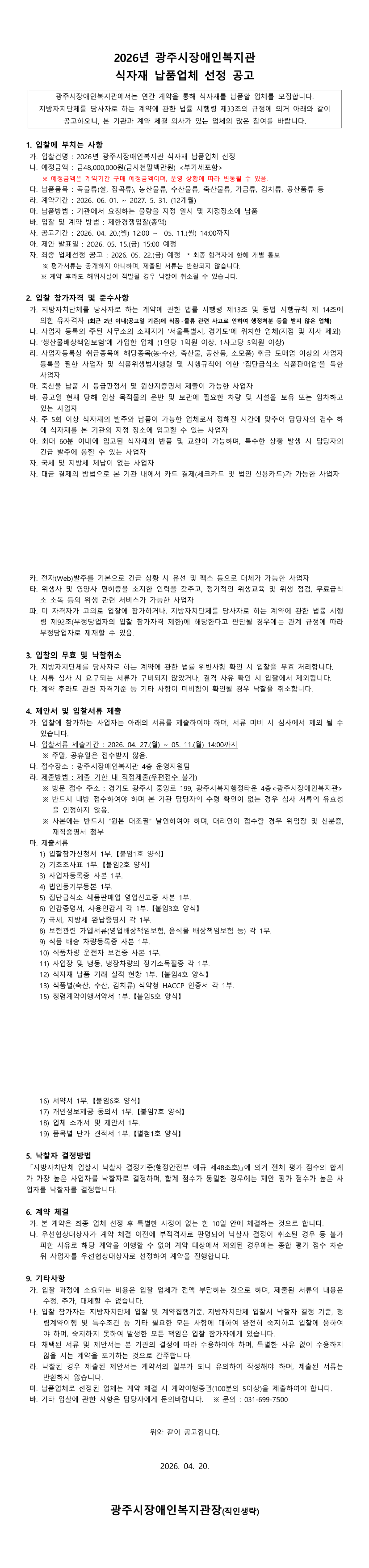 2026년 광주시장애인복지관 식자재 납품업체 입찰공고 |