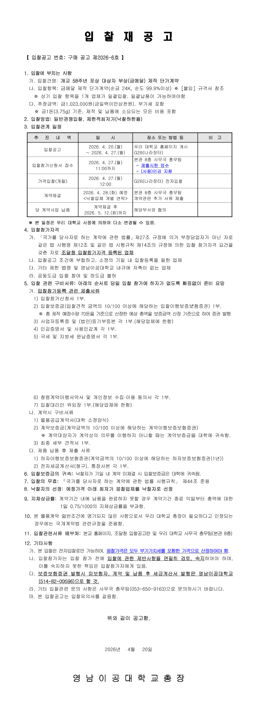개교 58주년 포상 대상자 부상(금메달) 제작 단가계약 |
