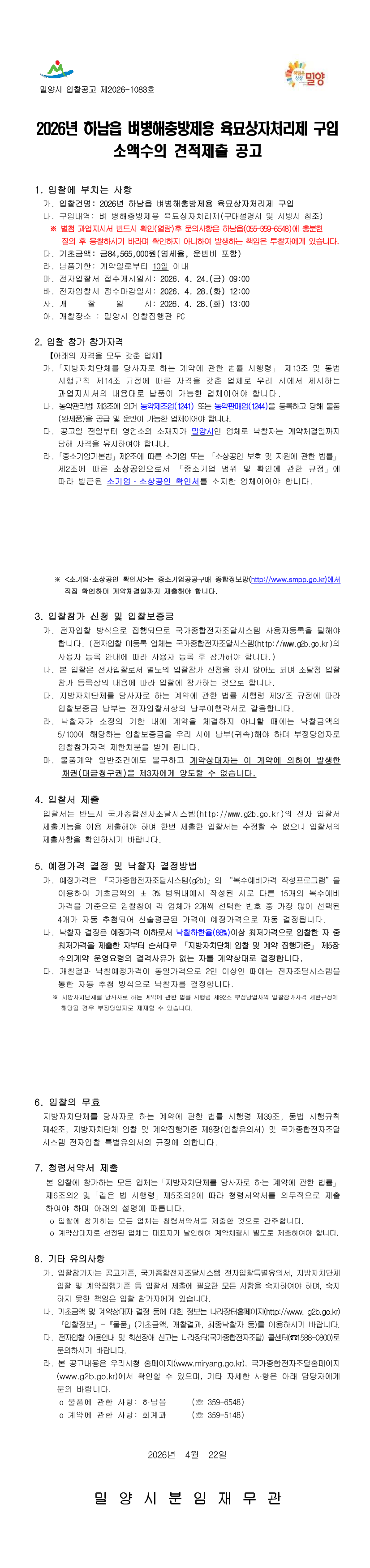2026년 하남읍 벼병해충방제용 육묘상자처리제 구입 |