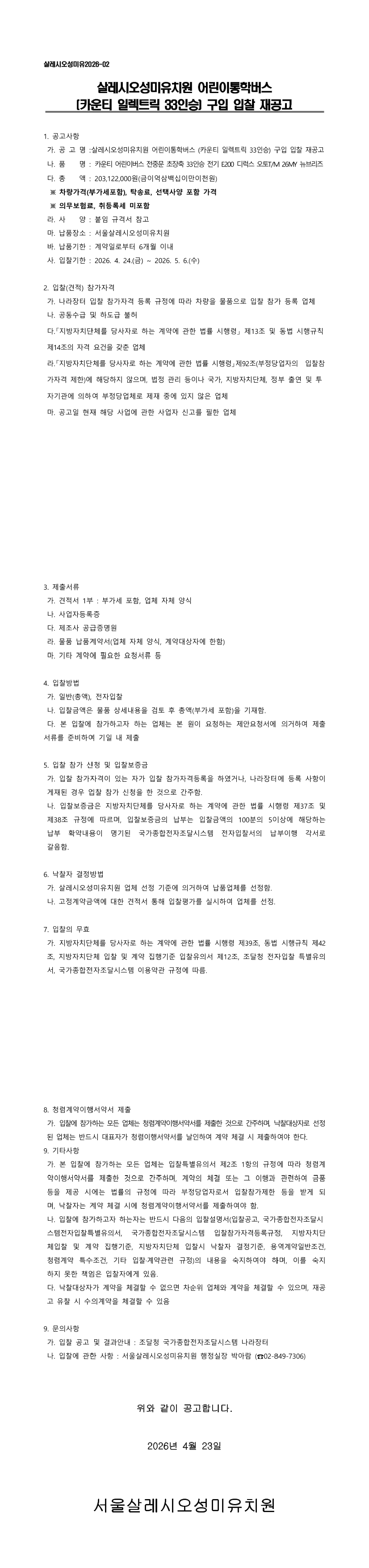 살레시오성미유치원 어린이통학버스(카운티 일렉트릭 33인승) 구입 입찰 재공고 |