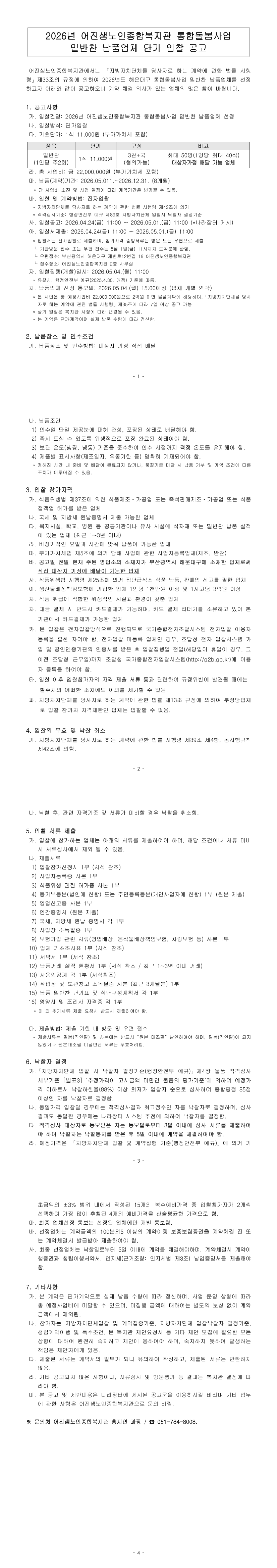 2026년 어진샘노인종합복지관 통합돌봄사업 밑반찬 납품업체 선정 |