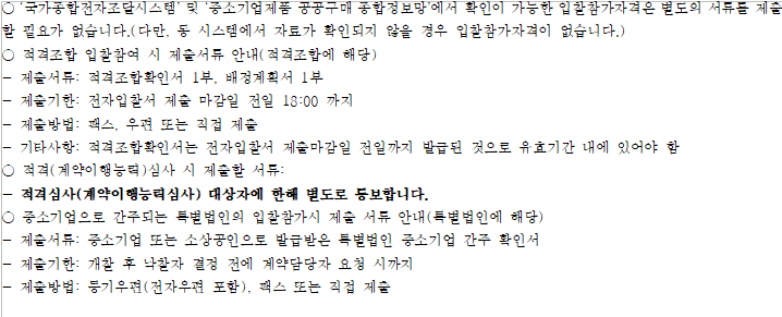 ○ 적격심사 대상자는 국가종합전자조달(G2B)시스템을 통하여 통보(받은 문서함에서 확인)하며, 적격심사에 소요되는 행정
