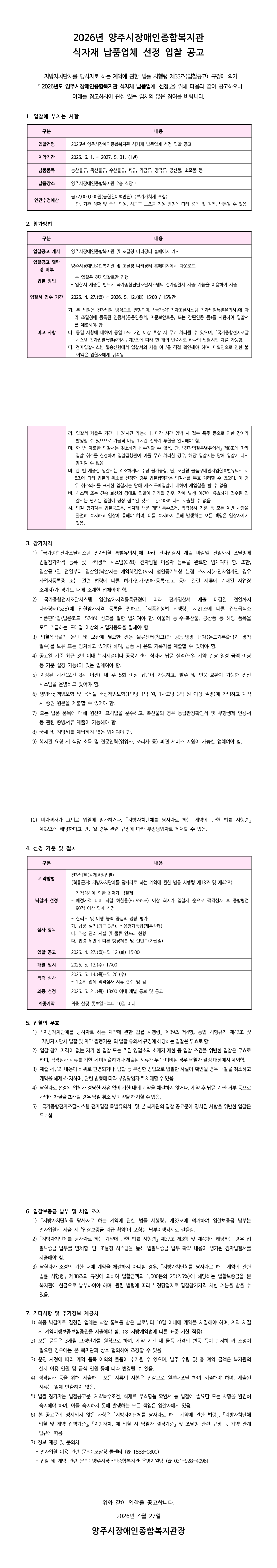 2026년 양주시장애인종합복지관 식자재 납품업체 선정 입찰 공고 |