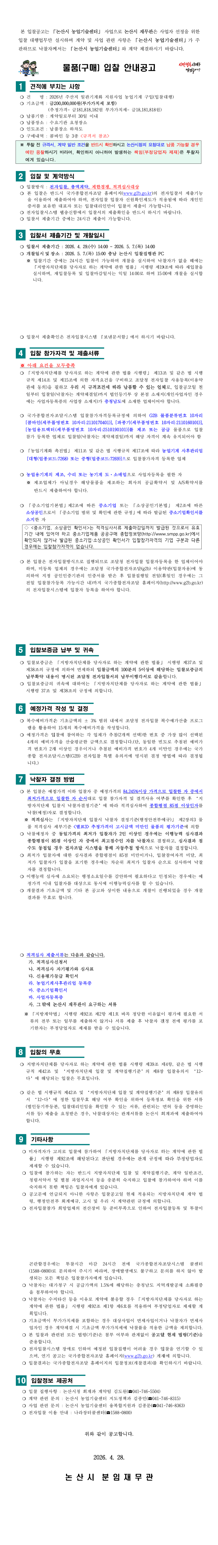 2026년 주산지 일관기계화 지원사업 농업기계 구입(입찰대행) |