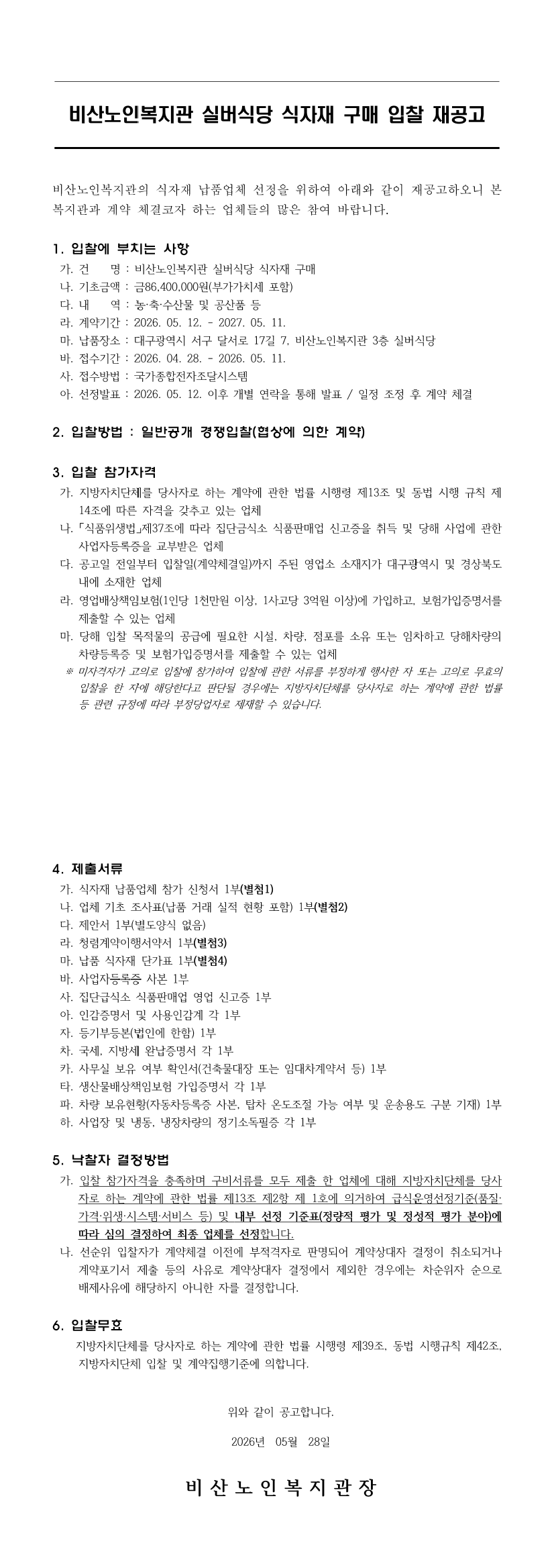 비산노인복지관 실버식당 식자재 구매 입찰 공고 |