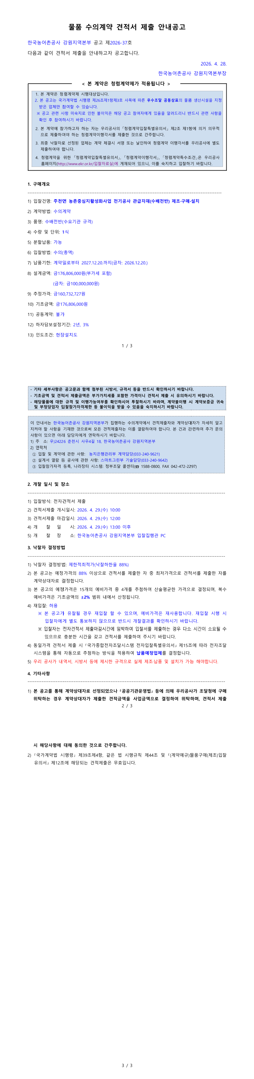 주천면 농촌중심지활성화사업 전기공사 관급자재(수배전반) 제조·구매·설치 |
