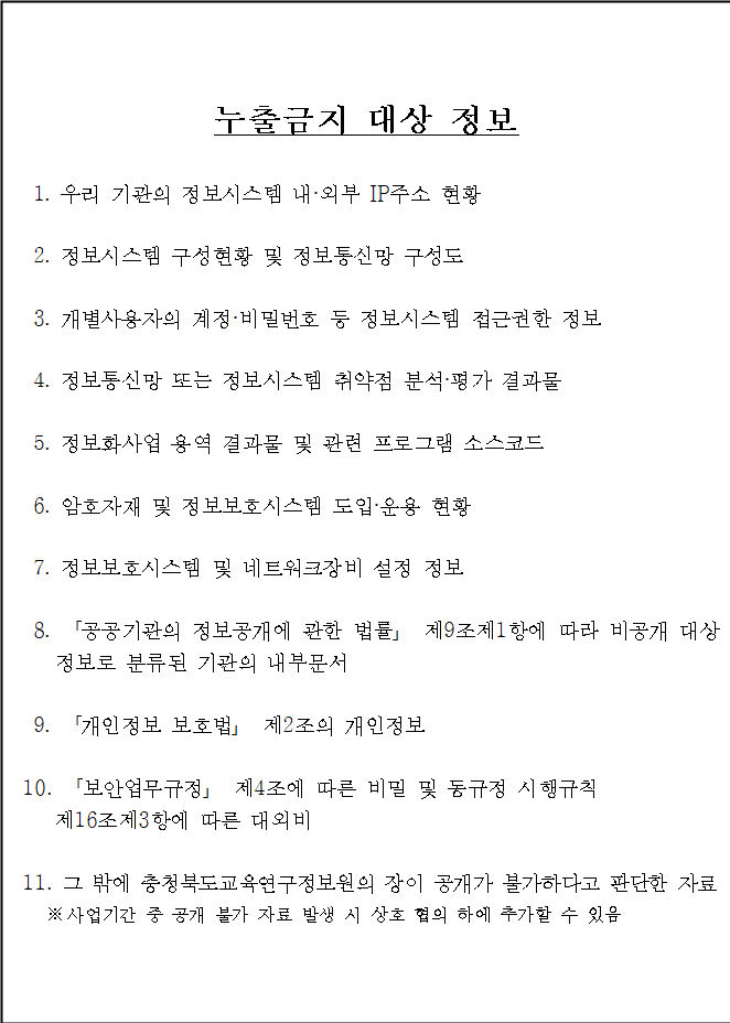 ( 업체명 )는 충북교육연구정보원의 「K-에듀파인 통합스토리지 증설」 사업을 수행함에 있어 재해예방을 위하여 아래의 내용과 관련 법규에서 정한 필수사항을 철저히 준수할 것을 다음과 같이 서약합니다.