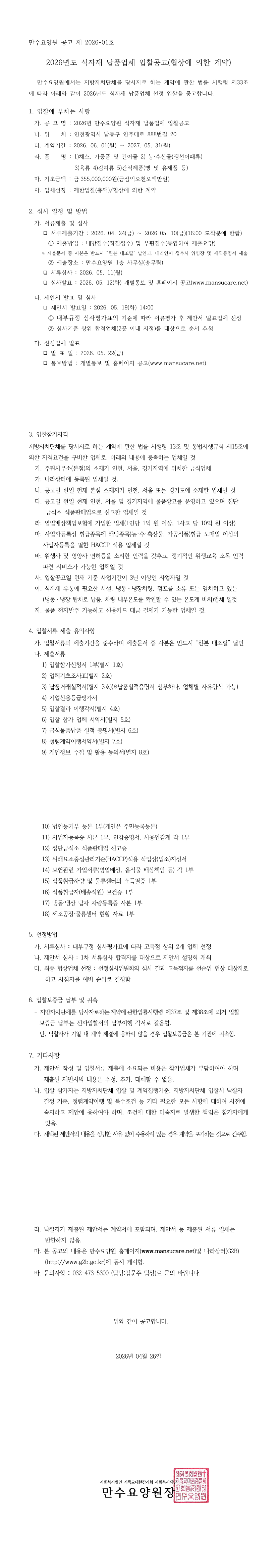 2026 만수요양원 식자재 납품업체 선정의 건 |