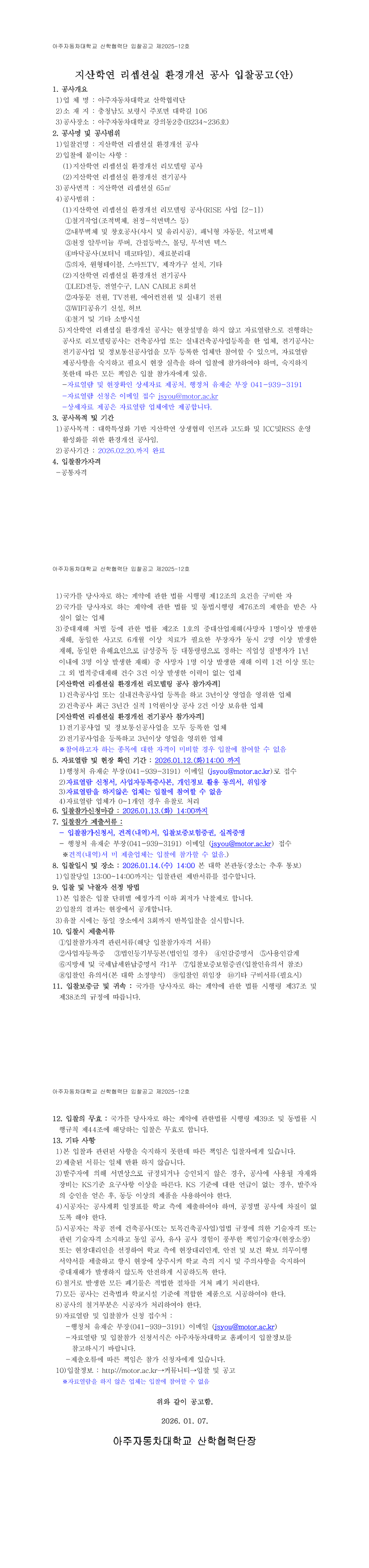 입찰공고 제2025-12호 지산학연 리셉션실 환경개선 공사 |
