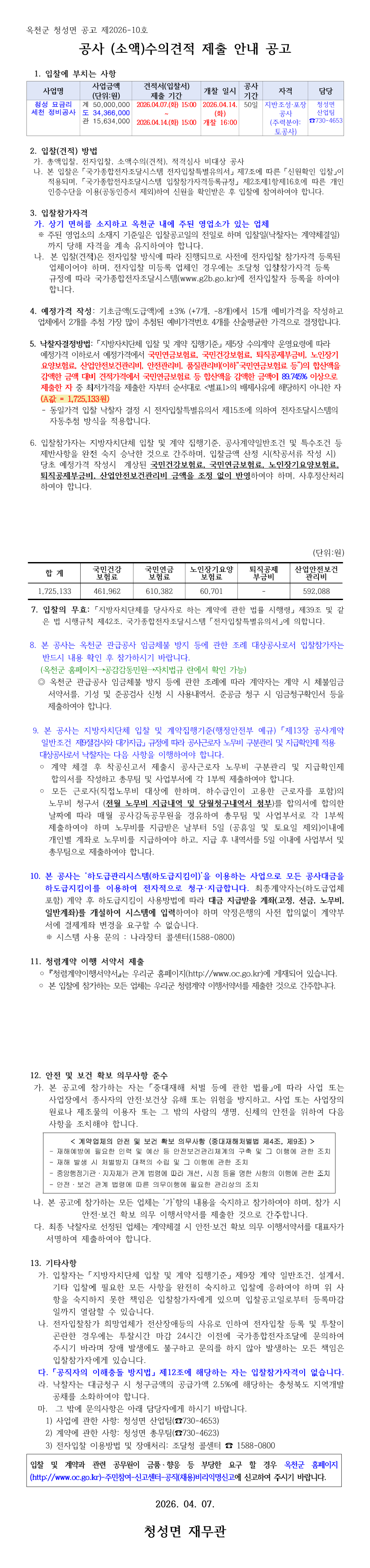 청성 묘금리 세천 정비공사 입찰 공고 |