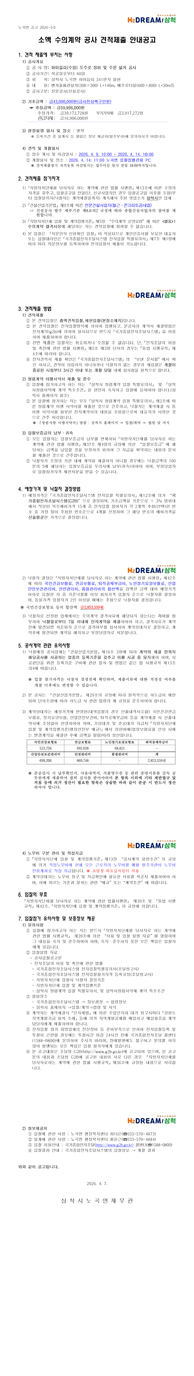 소액수의 견적 제출 공고【하마읍리(수암) 도수로 정비 및 수문 설치 공사】 |