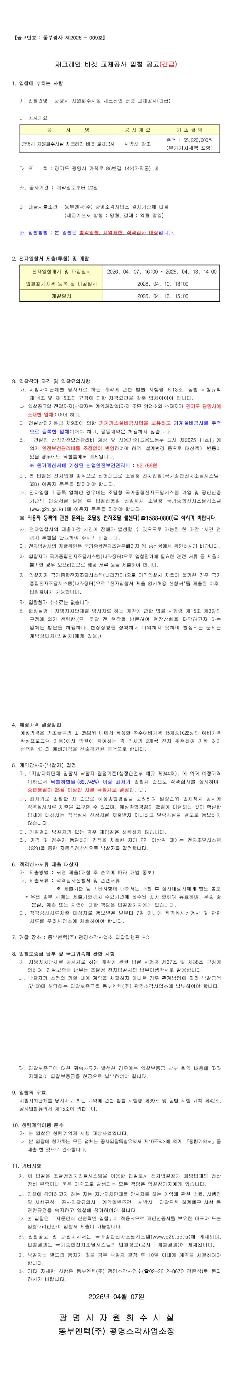 광명시 자원회수시설 재크레인 버켓 교체공사(긴급) |