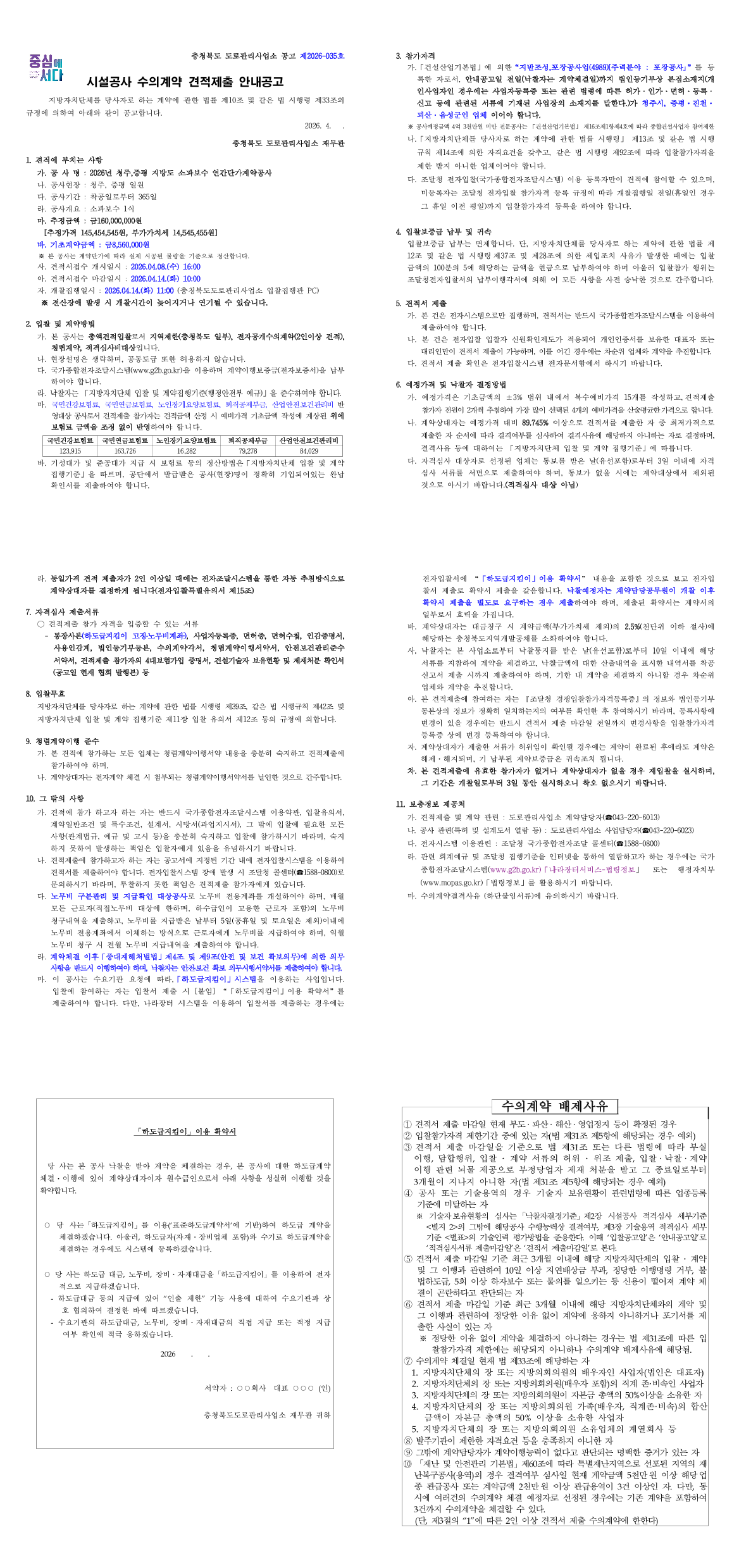 2026년 청주,증평 지방도 소파보수 연간단가계약공사 |