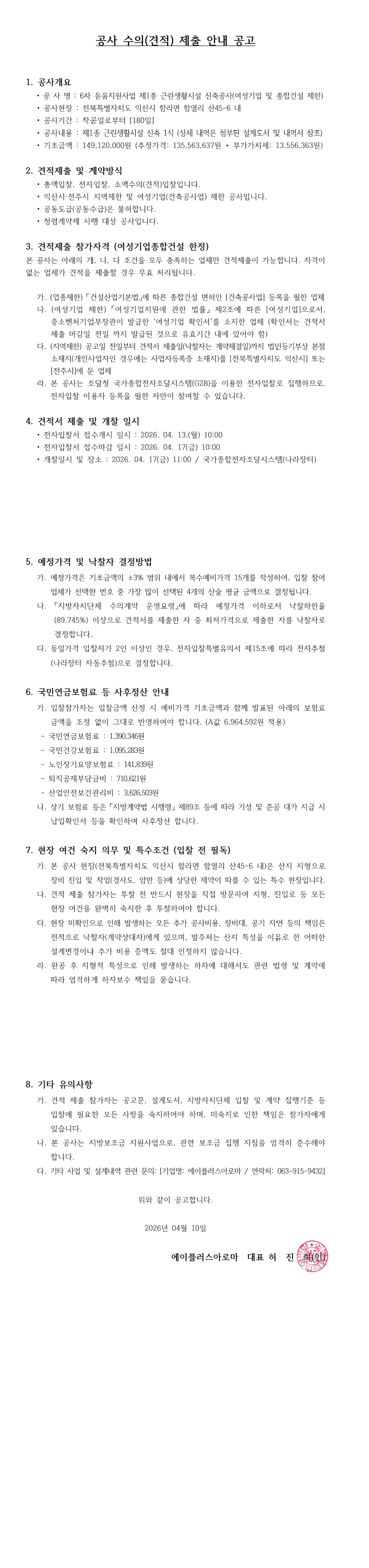 6차 돋움지원사업 제1종 근린생활시설 신축공사(여성기업종합건설 제한) |